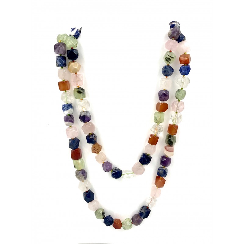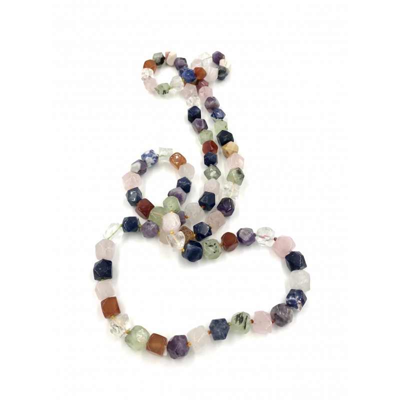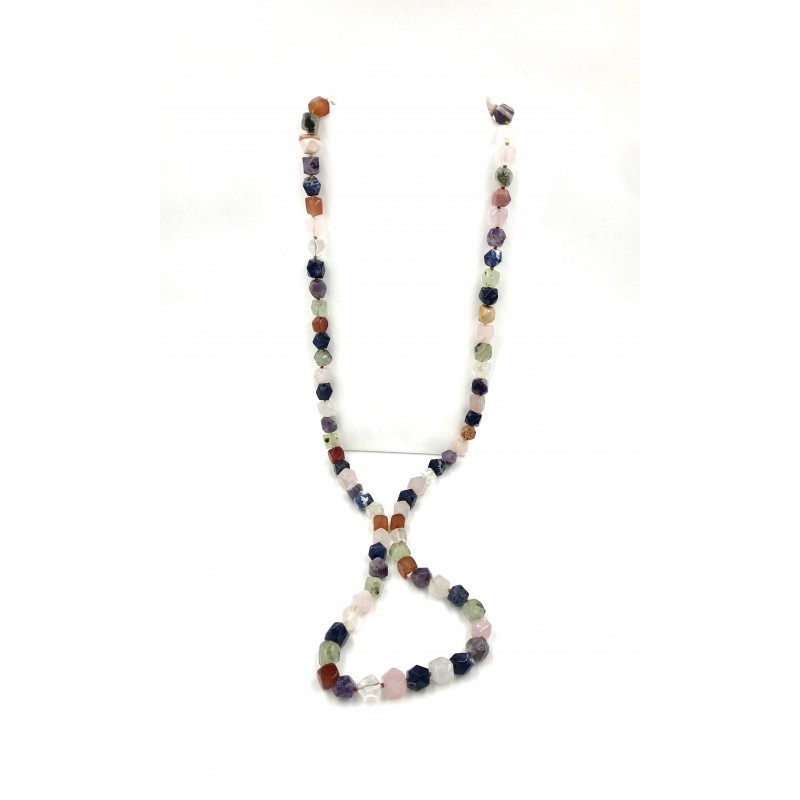 Composé de superbes pierres mixtes, ce collier avec pierres en formes irrégulières de 14mm environ vous fait voyager par la splendeur des perles améthyste, Cornaline, Quartz rose, Cristal, Sodalite, Mokaite, Phrénite. Ce collier vous est proposé en modèle sautoir.