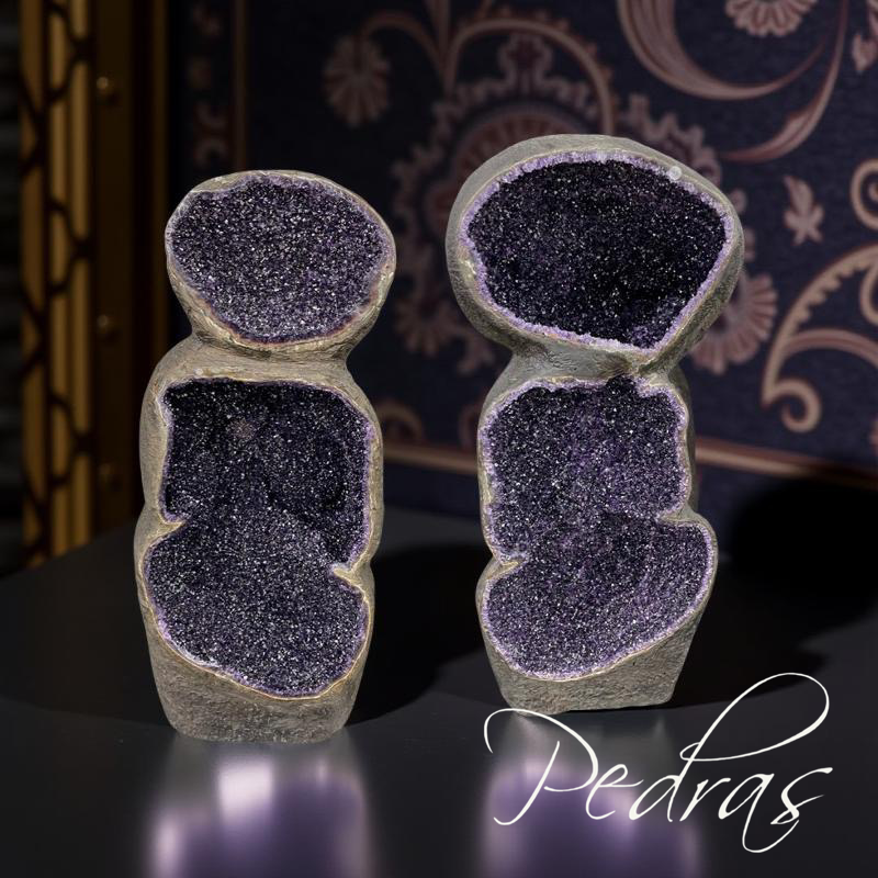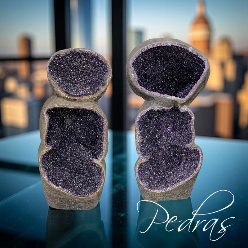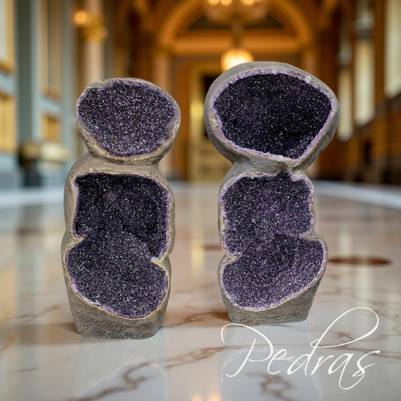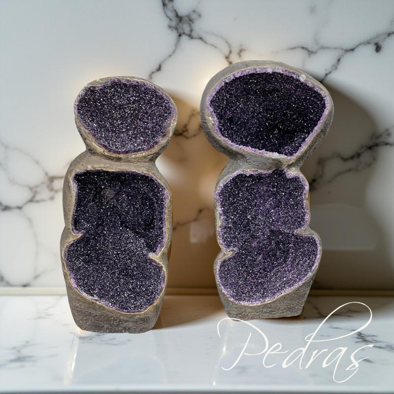 Ces deux géodes en améthyste sont des pièces uniques pour ajouter une touche spéciale à votre maison ou bureau. Avec une cristallisation incroyable, ces deux formes spéciales du même géode ne manqueront pas d'attirer l'attention et de surprendre dans n'importe quel environnement.
