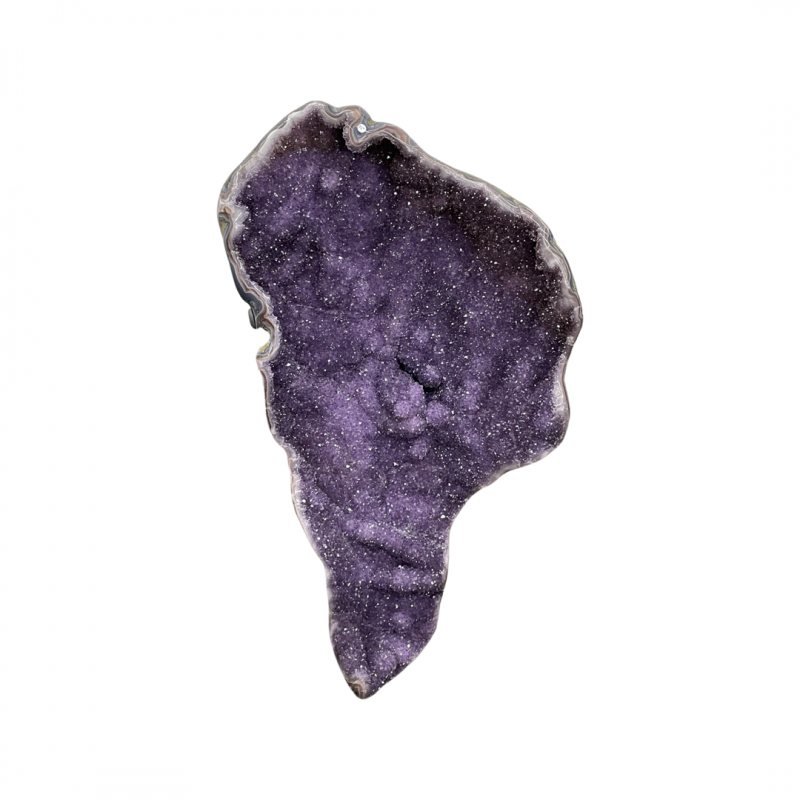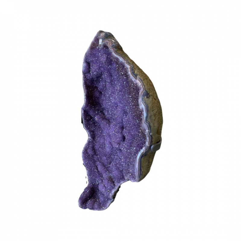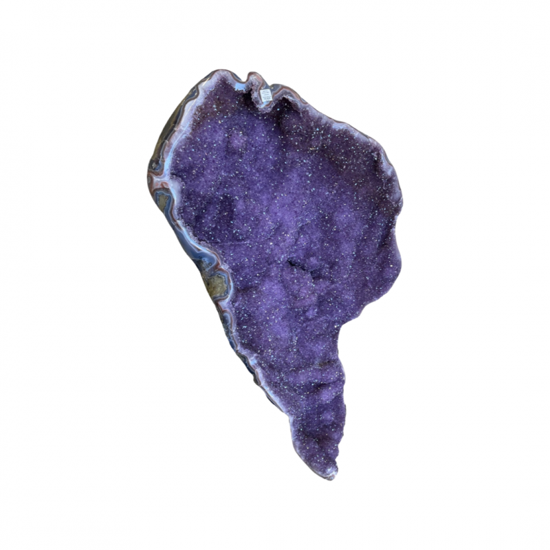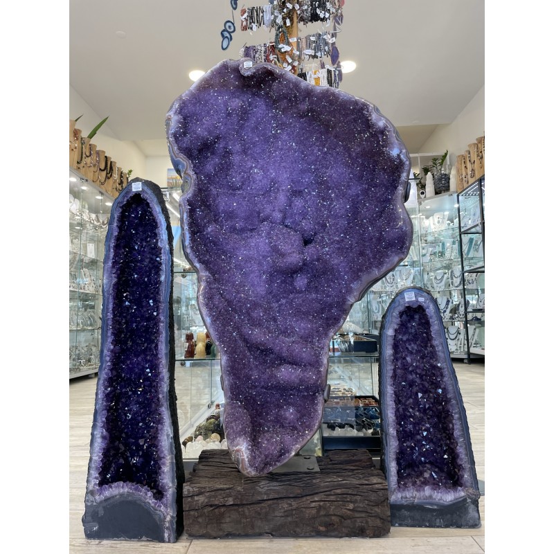 Belle géode de Améthyste du Uruguay, "AS AMERICAS" base em bois