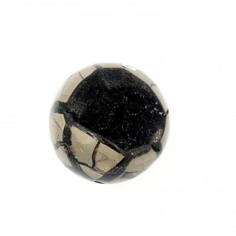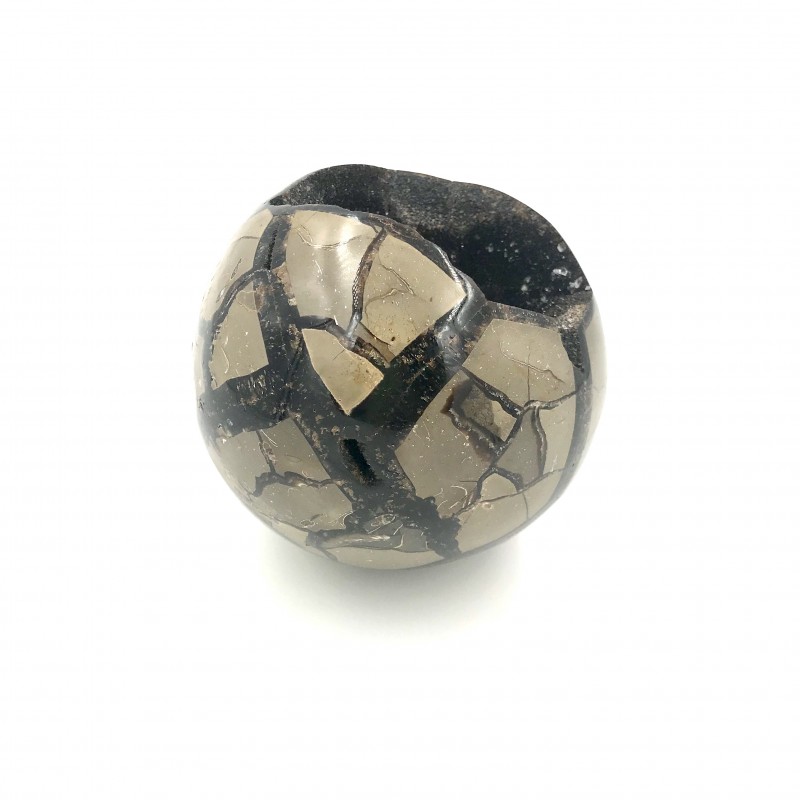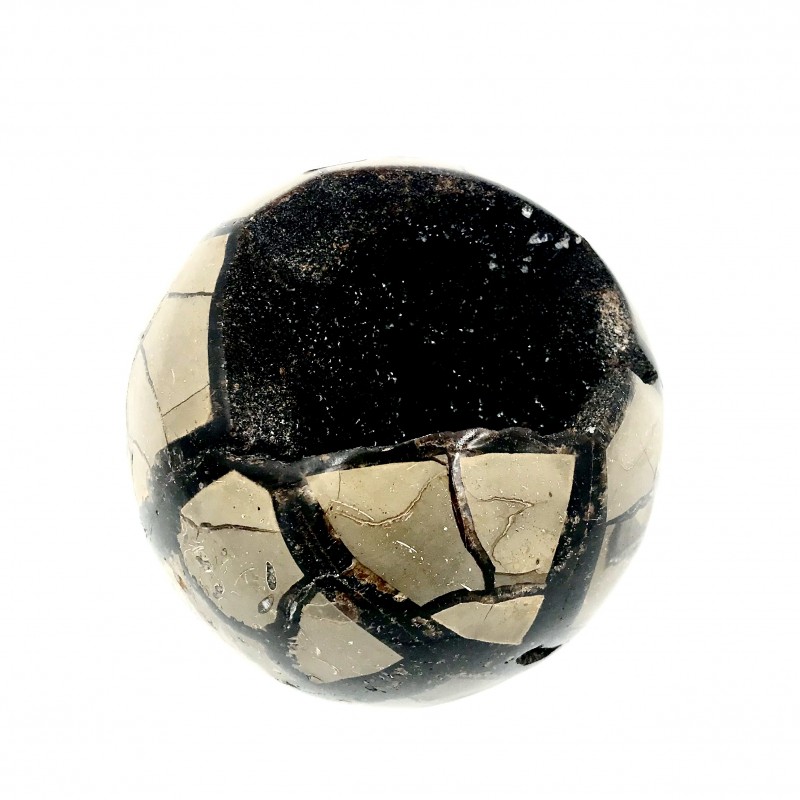 Sphère de Septaria avec son coté brute noire.