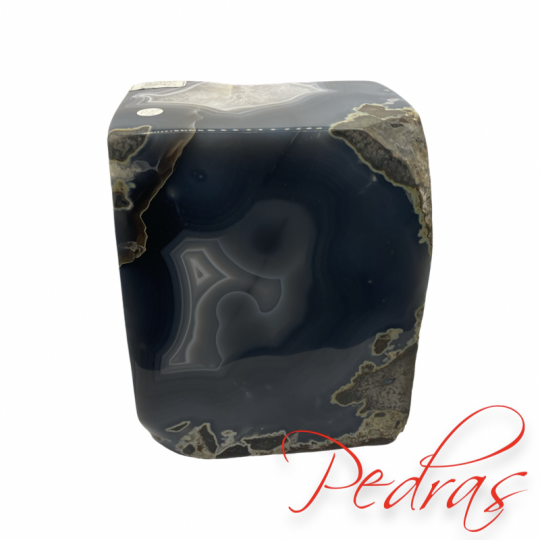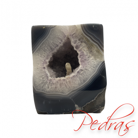 Ágata quadrada com terminação em ametista, cristalização de uma bela calcita e sua tipografia “A” Em um nível mental. As cores vibrantes da ágata de ampliam o clima criativo para ajudá-lo a se conectar com ideias artísticas. Com seus padrões em forma de listras, esta pedra também o ajuda a reconhecer padrões em sua vida e em você mesmo. É útil para se tornar ciente dos padrões repetitivos e para esclarecer as mudanças que você deve escolher fazer. Quando você está no processo de transformar sua realidade, uma das primeiras tarefas é usar a ferramenta de auto-observação. Esta ferramenta dá a você a habilidade de observar quando você está preso em uma rotina ou em sistemas de crenças limitados.Em um nível emocional. Ágata pode ajudá-lo a se envolver com suas emoções turbilhantes usando o pensamento abstrato. Uma vez que oferece a capacidade de ver as coisas de forma criativa, fornece dados objetivos. Torna mais fácil ver suas emoções de muitos ângulos diferentes, removendo assim o forte apego a essas emoções. Use esta pedra para expressar suas emoções de forma artística.No nível físico. Ágata é excelente em melhorar o tom da pele, a textura e a produção de colágeno. Independentemente da cor da pedra, a energia subjacente a todas as ágatas está se estabilizando. Quando você combina a alta energia criativa encontrada nesta pedra com a energia de ancoragem, obtém ajuda adicional na manifestação da ação consciente para atingir suas intenções. É uma pedra destinada a artistas e inventores.