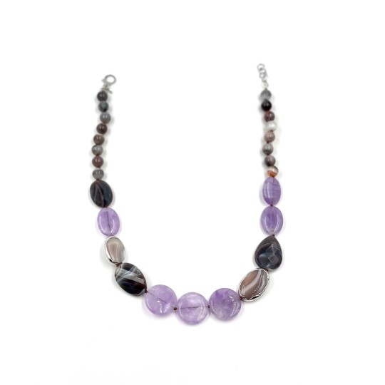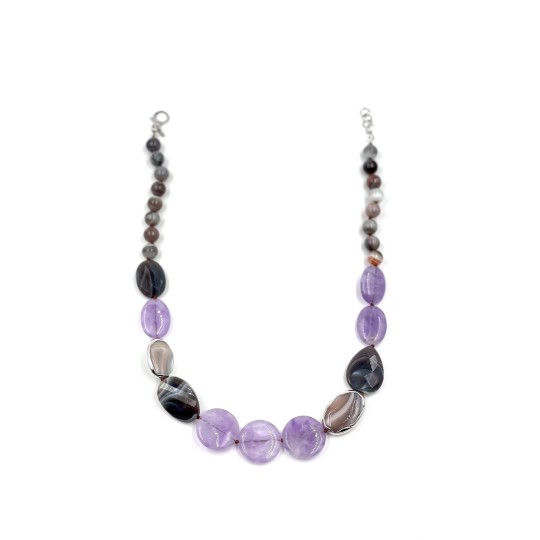 Composto por magníficas pedras de Ametista e Ágata, este colar com pedras de diferentes formas facetadas e lisas, algumas pedras revestidas a ródio com prata 925, leva-o numa viagem através de esplendorosas contas roxas.