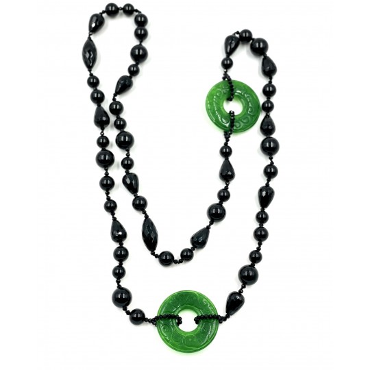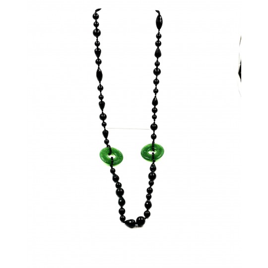 Composto por magníficas pedras de Ágata negra em 6 tamanhos diferentes e 2 donuts de jade, leva você a uma viagem pelo esplendor das pérolas negras.Em um nível mental. A ágata negra é uma ferramenta útil para estabilizar sua consciência ao se conectar com o solo. É fácil se distrair, se ramificar e nunca fazer nada, mas esta pedra pode mantê-lo focado na tarefa sem problemas, enquanto permite a energia da diversão, do jogo e da criatividade.Em um nível emocional. A ágata negra lembra que rir e brincar são as chaves para um estado emocional equilibrado. Esta pedra quer que você faça tortas de areia e reative sua natureza infantil. A energia despreocupada, fortemente alinhada com os espíritos da natureza, ajuda você a curar sua criança interior e questões relacionadas ao passado. Essa pedra também permite que você classifique suas emoções para que possa reconhecer que a única coisa que existe é o momento presente.No nível físico. A ágata negra é uma boa ferramenta para equilibrar os processos de absorção e eliminação do corpo físico. Essa pedra ajuda a remover toxinas do corpo físico por meio da reconexão com a natureza. Lembra você de passar um tempo com as árvores, a grama e as flores, o que ajuda na saúde física e no bem-estar. Esta pedra é adequada para jardineiros, paisagistas, fitoterapeutas, aromaterapeutas e ambientalistas.