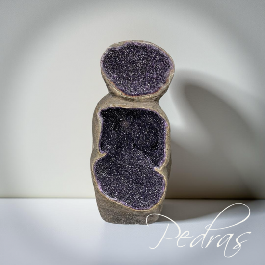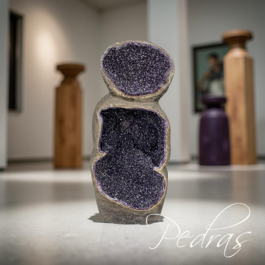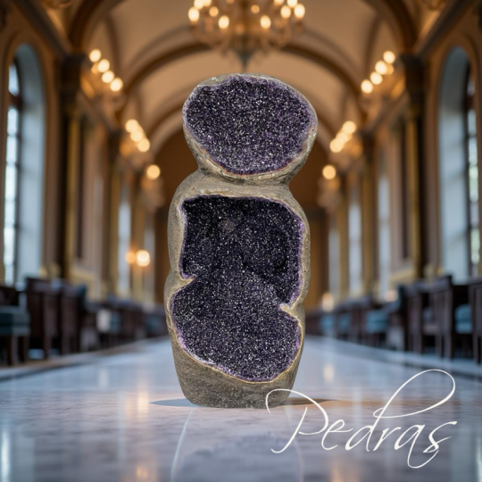 Geodo de Ametista bruta “ET2” UruguayUma ametista de beleza singular para agregar sofisticação e cor à sua casa ou escritório. Seus padrões cristalinos são notáveis e sua forma única se destacará em qualquer ambiente.No nível mental. A vibração roxa da ametista é dotada de poderosas qualidades transformadoras. Para usar essa vibração com o propósito de transformar situações indesejadas, imagine que você está cercado por uma bolha vibrante e brilhante de luz roxa que emana da pedra. Enquanto você imagina, saiba que tudo o que o perturba ou lhe causa problemas está sendo transformado e transmutado em algo poderoso. Imagine a situação mudando para o que você deseja de onde está agora. A vibração da sua imaginação, dependendo do que você deseja que a sua vida combine com a luz roxa, afetará as mudanças.No nível emocional. Quando você percebe que suas emoções precisam ser transformadas ou drasticamente alteradas, a energia violeta da ametista lhe dá a força e os recursos para efetuar a mudança. Imagine estar cercado pela energia roxa desta pedra enquanto se concentra em como gostaria de se sentir.No nível físico. Como a ametista deriva seu nome da palavra grega amethystos, que significa “não bêbado” ou “não embriagado”, carregue ou use esta pedra para lembrar de evitar distrações prejudiciais e mudar hábitos antigos. intenção consciente. A associação com a embriaguez é inspirada em um mito romano que envolve Baco, o deus romano do vinho e da embriaguez. Cada vez que você toca a pedra ou olha para ela, imagine sua nova realidade como se esse velho hábito fosse uma memória distante. Como seria sua vida sem esse hábito? Aproveite o tempo para imaginar.