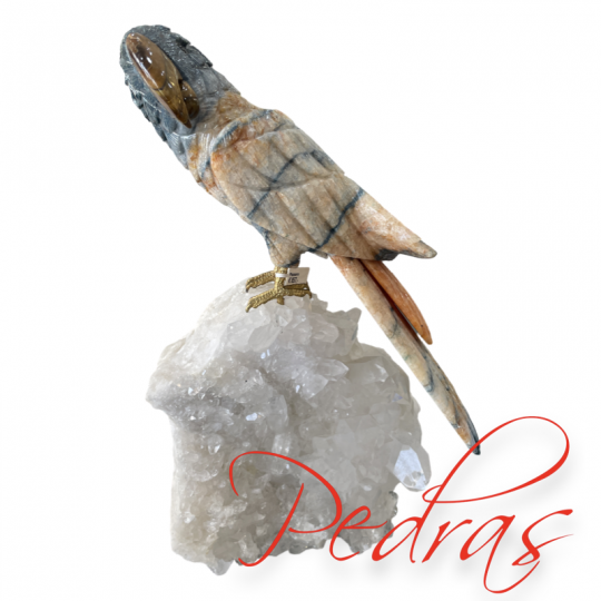 Pássaro Calcitas e bico em olho de tigre colocadas em um bloco de Cristal de Rocha