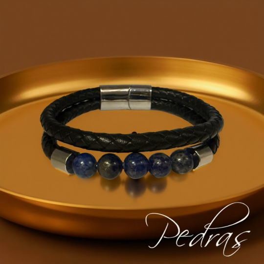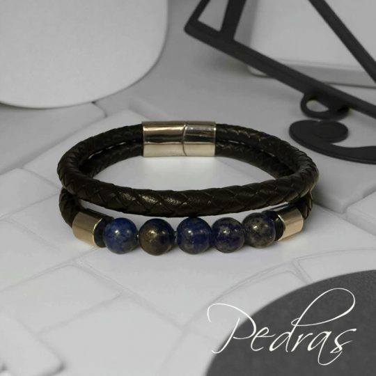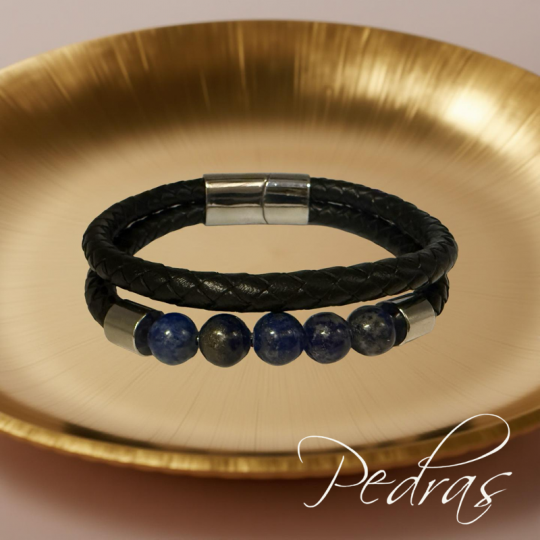 Pulseira Masculina 2 cordões de couro e 5 bolas em Lapis Lazuli.