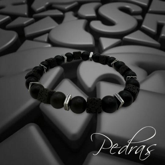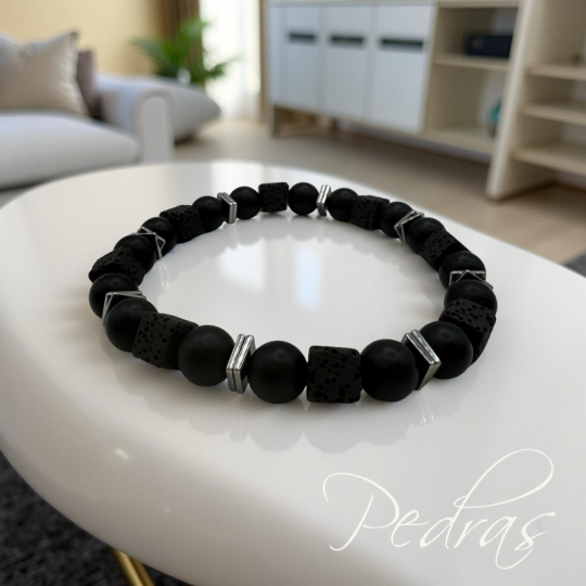 Pulseira Masculina de Ônix Fosco, Lava Quadrada e Quadrado Plano em Hematita galvanizada