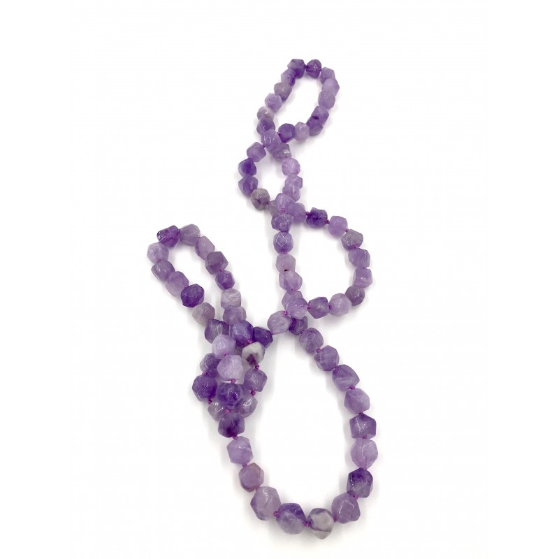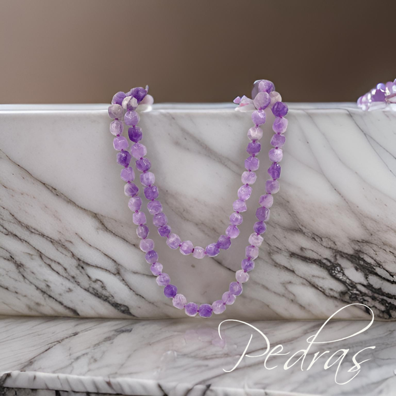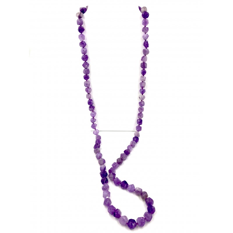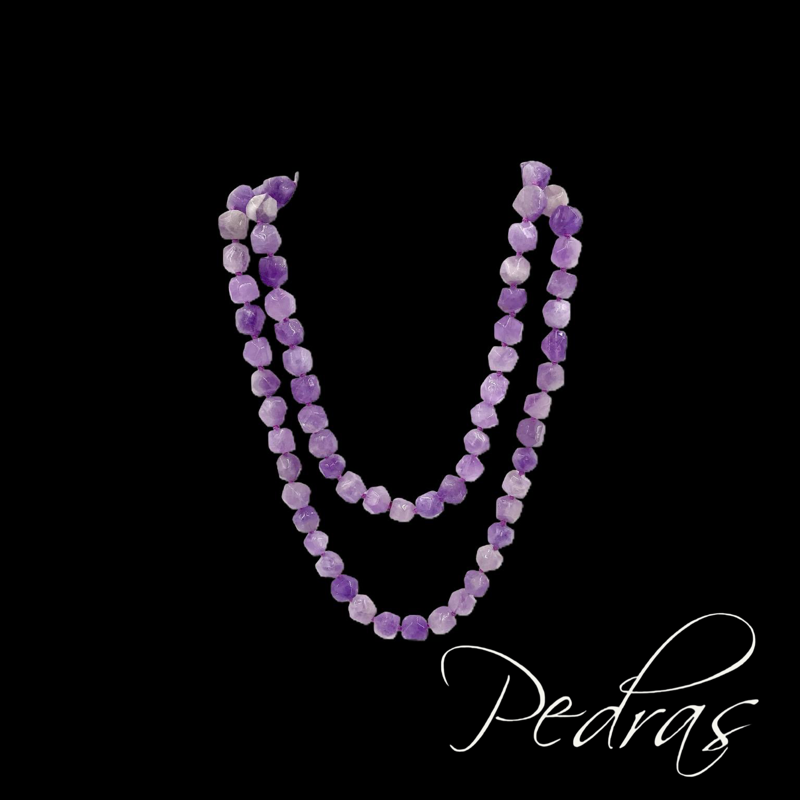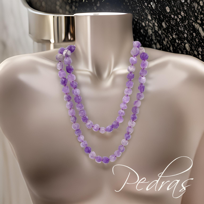 Composto de belas pedras de ametista, esse colar com pedras inrregulares de 14mm em média, nos faz viajar pelo esplandor dessas pedras violetas. Esse colar é em formato sautoir.