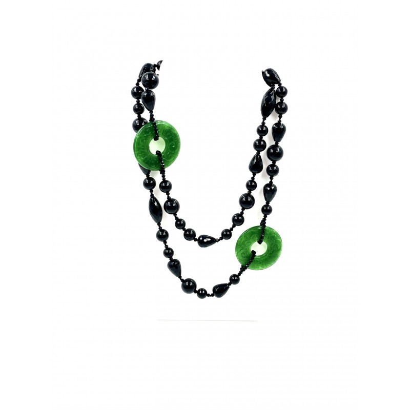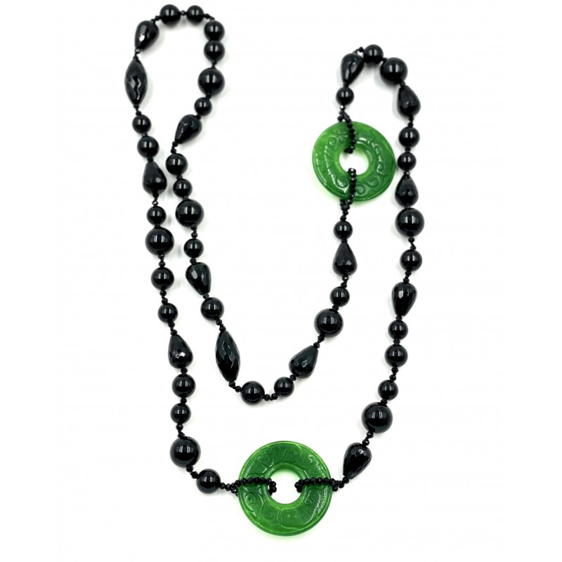 Composto por magníficas pedras de Ágata negra em 6 tamanhos diferentes e 2 donuts de jade, leva você a uma viagem pelo esplendor das pérolas negras.