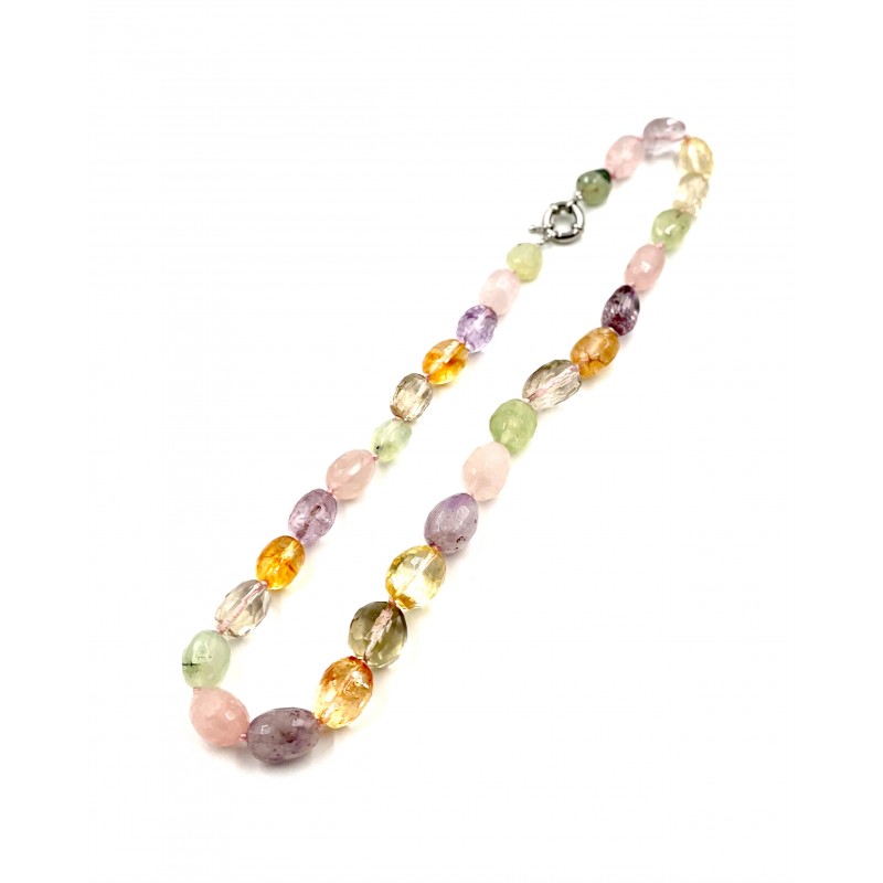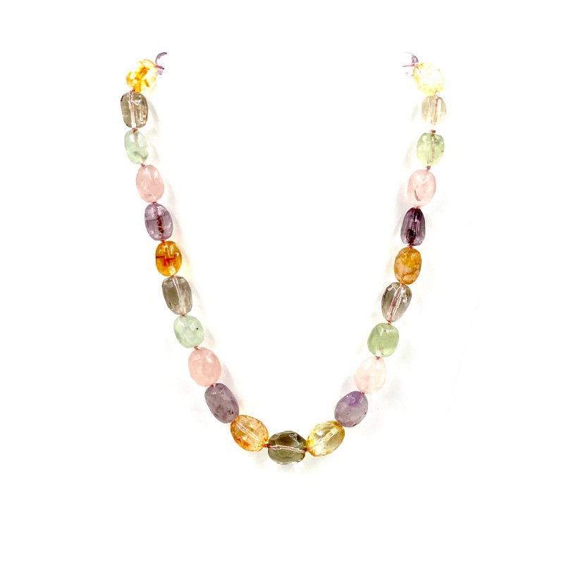 Composto por magníficas pedras misturadas, este colar de pedra de forma irregular vai leva você ao esplendor das contas de ametista, citrino, quartzo rosa, quartzo fumado, phrenita.