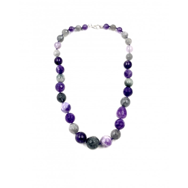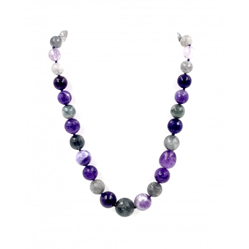 Composto por magníficas pedras de Ametista, Ágata e Olho de Gato, este colar com diferentes pérolas aproximadamente 8mm à 12mm facetadas e lisas.