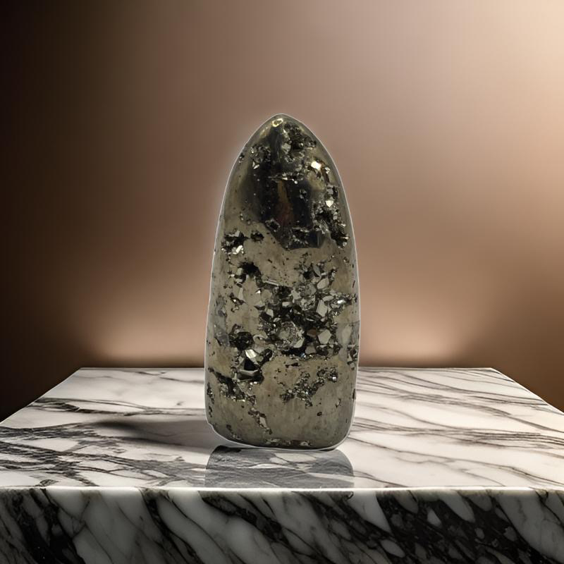 Em um nível emocional. Pirita ajuda a criar coragem e autoconfiança. Use esta pedra quando precisar de coragem para definir limites e se defender. Ajuda você a sentir seu poder. Esta gema dourada oferece a oportunidade de permitir a reflexão e o desenvolvimento de suas qualidades positivas.